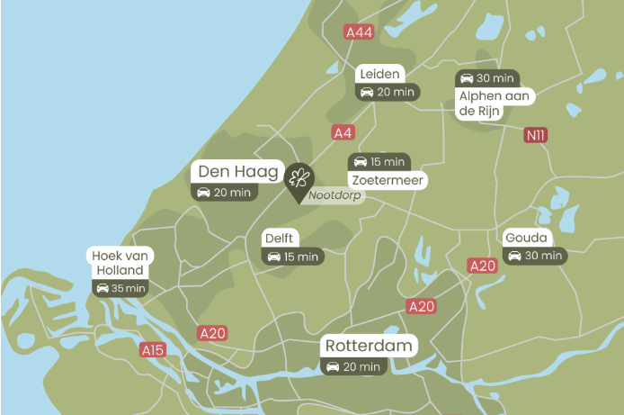 Nootdorp is een charmant dorp met een warm, hecht gemeenschapsgevoel. In het levendige dorpscentrum struin je langs winkels, terrassen en de gezellige weekmarkt. Op korte afstand liggen het inspirerende cultureel centrum CulturA & Zo en de apotheek – voorzieningen die het dagelijks leven nét wat makkelijker én leuker maken. De verbinding met de Randstad is bovendien uitstekend: bus- en tramhaltes naar omliggende steden zijn binnen enkele minuten te bereiken en via de A12 of A4 ben je zo op weg.